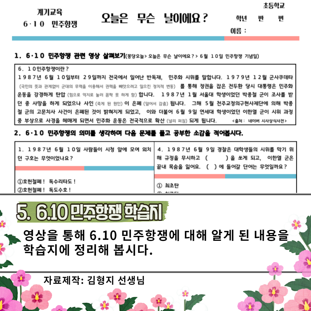 몽당분필에서 호국보훈의 달을 맞이하여 현충일, 6월 민주항쟁, 6.25 전쟁에 대하여 알아볼 수 있는 교육자료집을 준비했습니다.