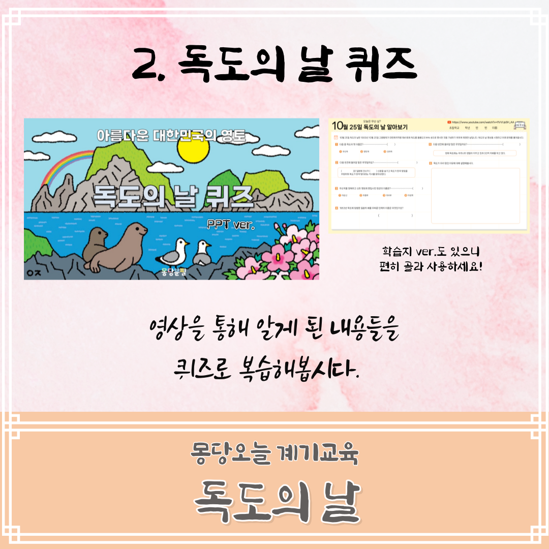 퀴즈, 컬러링, 미션놀이, 만들기 등 다양한 학습자료들로 독도의 날을 공부해봅시다!